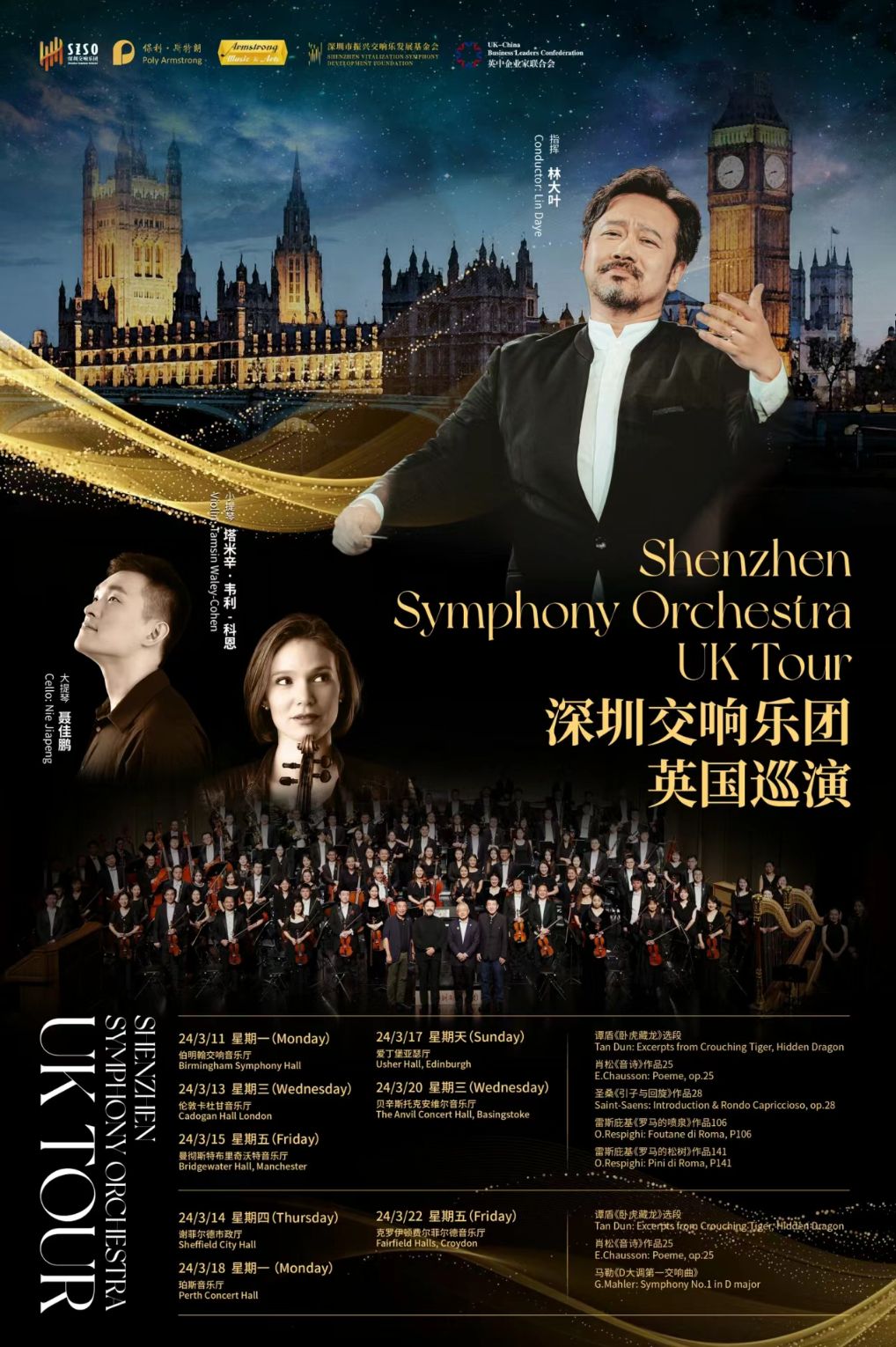 伦敦当地时间3月13日晚,深圳交响乐团在卡杜甘音乐厅举办了英伦巡演的第二场音乐会。在音乐总监林大叶激情指挥下,深圳交响乐团演奏了华人音乐家谭盾的《卧虎藏龙》大提琴协奏曲、法国作曲家欧内斯特·肖颂《音诗》、法国作曲家圣-桑《引子与回旋随想曲》、意大利作曲家雷斯庇基著名的《罗马的喷泉》《罗马的松树》等中外优秀交响乐曲。来自中国的青年大提琴家聂佳鹏以及英国优秀的小提琴家塔米辛·韦利-科恩与深圳交响乐团合作,为伦敦市民献上了一场美妙绝伦的交响盛宴。