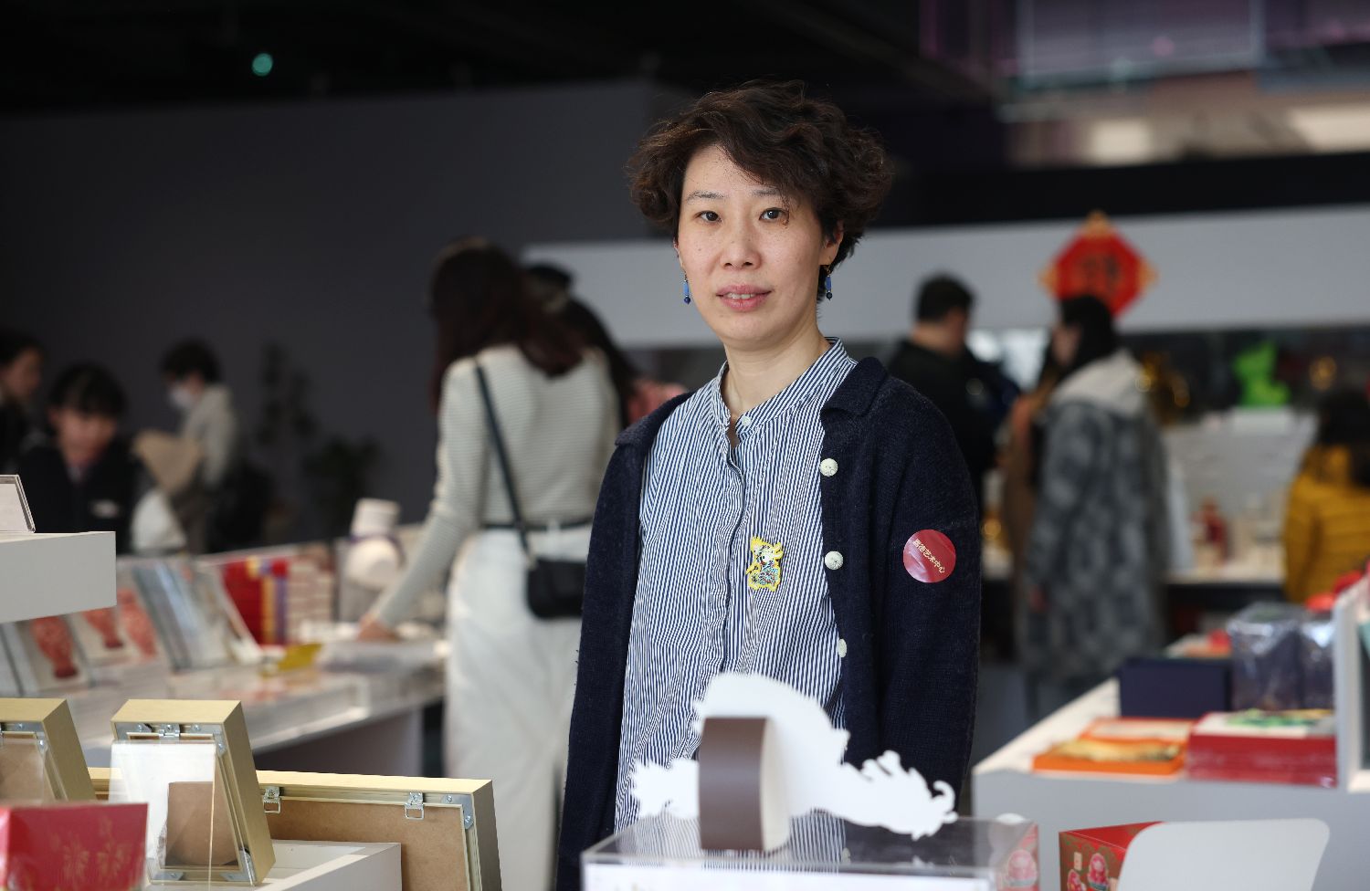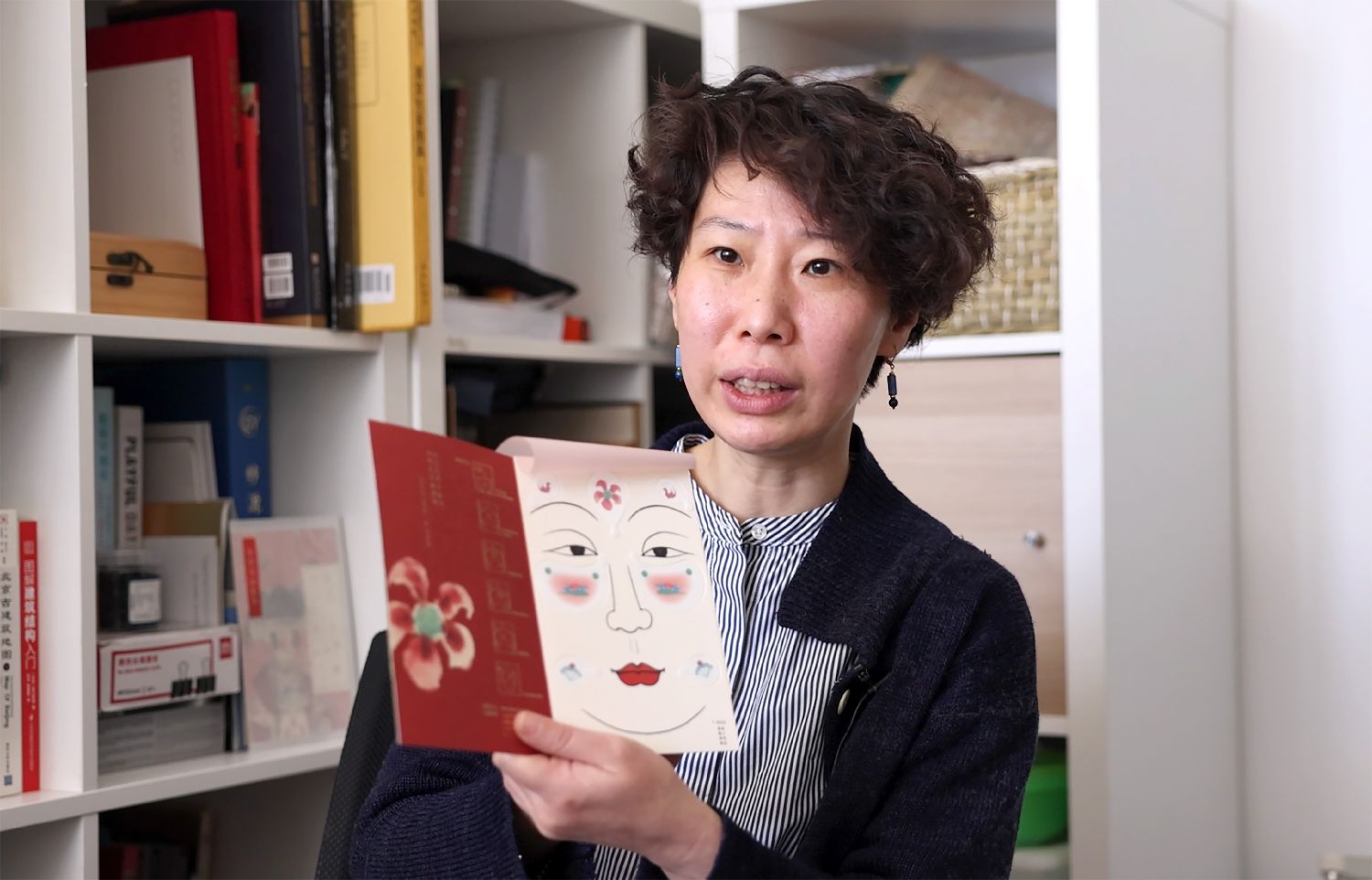 近日,刘仌向记者介绍根据敦煌莫高窟供养人设计而成的花钿贺卡。