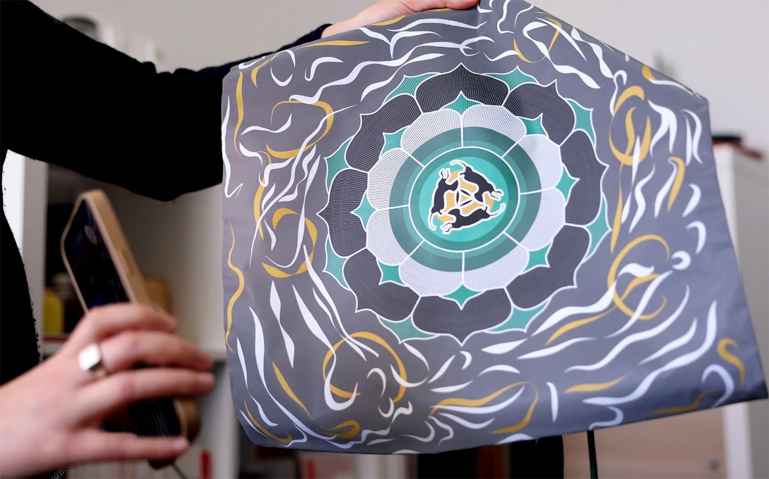 近日,刘仌展示其团队根据敦煌莫高窟的藻井纹设计的一款便携包。