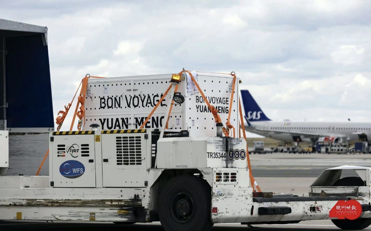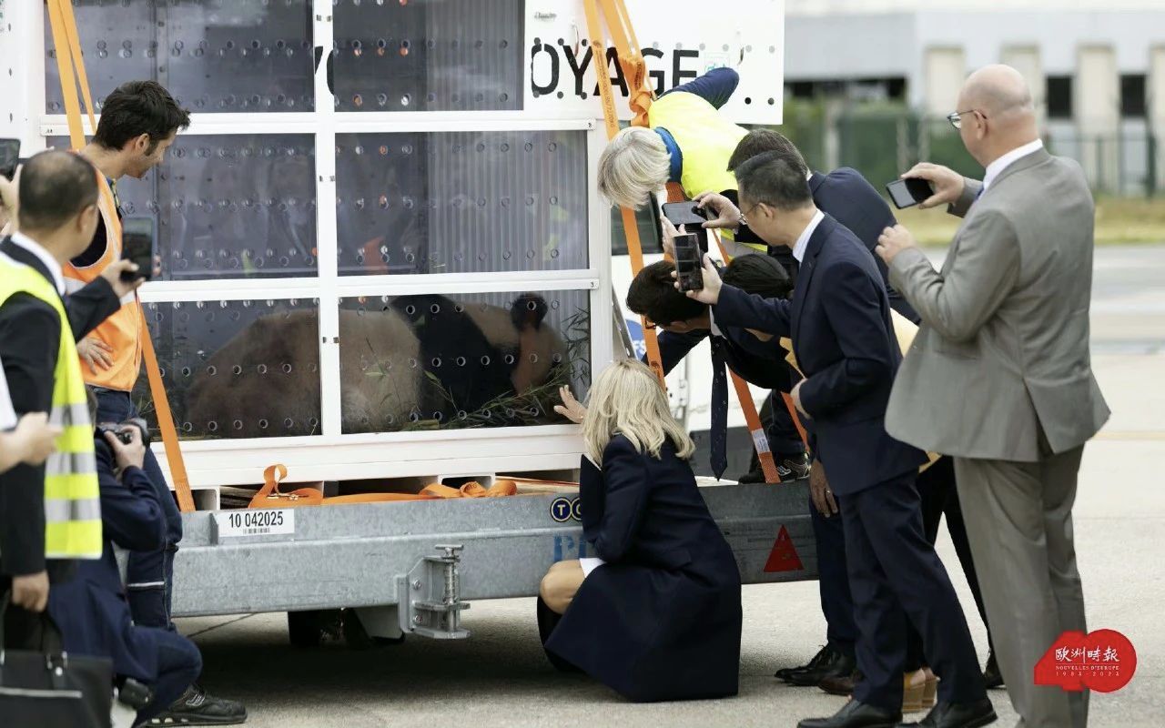 2023年7月25日,在法国出生的大熊猫“圆梦”搭乘中国国际航空公司CA3120航班,自巴黎戴高乐机场启程返回中国成都大熊猫繁育研究基地,法国第一夫人布丽吉特·马克龙、中国驻法国大使卢沙野到机场送行。(图片来源:欧洲时报)