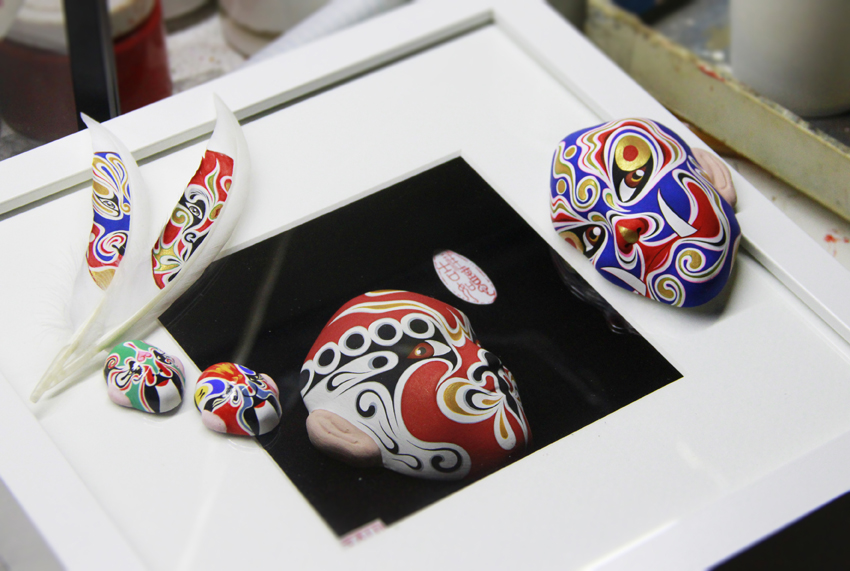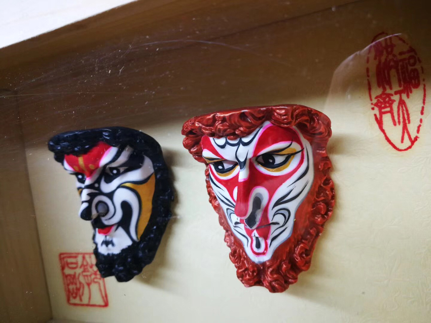 只见一副相框中,并排陈列着一红一黑带着“齐天大圣”和“钟馗”扮相的亚历山大戏剧脸谱,作品和大拇指两个指节高度差不多,看上去形态炯炯有神。“这西方骨骼的面孔画上东方的京剧脸谱别有一番感觉,和传统脸谱呈现的效果很不一样,很多朋友都特别喜欢我的这套新创作。”郭石刚说。