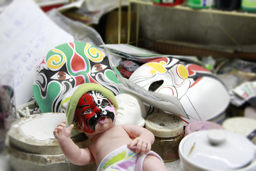 “这是被人丢弃的损坏的人偶,一次无意中被我发现给捡了回来,我给他做了帽子和衣服盖住了损坏的地方,然后又给他‘化了妆’,你看,这个蓝眼睛的外国娃娃加上这创意的中国‘花脸’是不是很带劲儿?”他指着躺在桌面上的一个娃娃兴奋地说到。