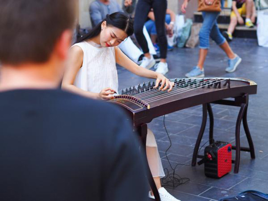 彭静旋在巴黎街头弹奏古筝引路人观看。(图片来源:视频截图)