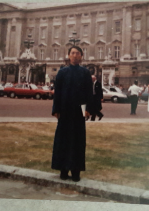 1983年,穿着中式长衫的王台生在白金汉宫花园派对上见到英国女王,图为他在白金汉宫外留影。(图片来源:除注明外均为受访者供图)