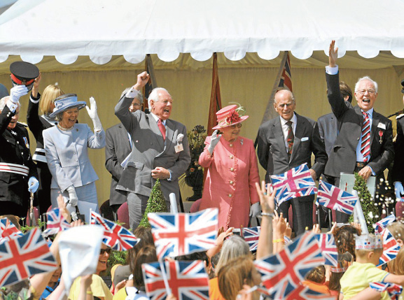 女王和菲利普亲王2012 年7 月12 日到访考斯福德皇家空军基地,出席当地举办的钻禧年庆典,童话带领中国文化表演方阵出席庆典。(图片来源:英国当地媒体Shropshire Star)