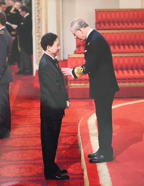 2011年,邓柱廷获得大英帝国官佐勋章。图为查尔斯王储为邓柱廷颁发奖章。(图片来源:邓柱廷本人提供)
