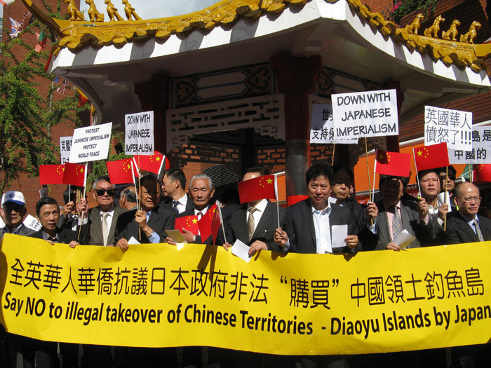 2013年9月18日,伦敦华埠商会和旅英爱国华人华侨发起“抗议日本‘非法’购买中国领土钓鱼岛”的游行示威活动,左图为邓柱廷(右五)和多位英国侨领举着国旗和抗议标语走在最前面。(图片来源:欧洲时报英国版)