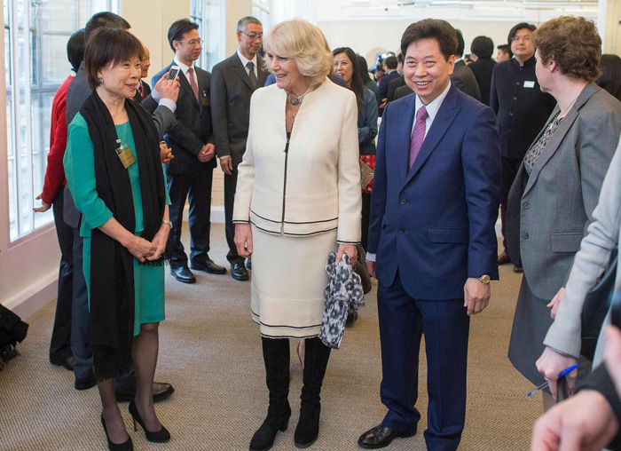 英国查尔斯王储和夫人卡米拉2015年2月再次访问伦敦华埠。图为邓柱廷陪同卡米拉(中)参观。(图片来源:邓柱廷本人提供)
