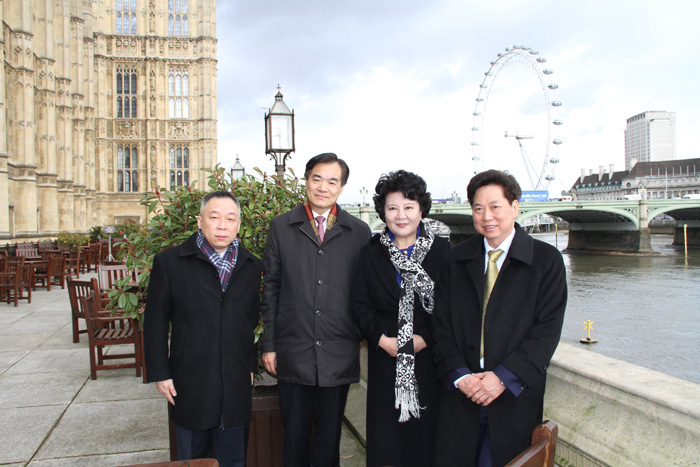 中国国侨办主任裘援平2015年春节访英期间,出席伦敦新春庆典,并对邓柱廷的贡献给予赞赏。图为(右起)邓柱廷、裘援平、欧洲时报社长张晓贝、常务副社长钟诚。(图片来源:欧洲时报记者严振羽 摄)