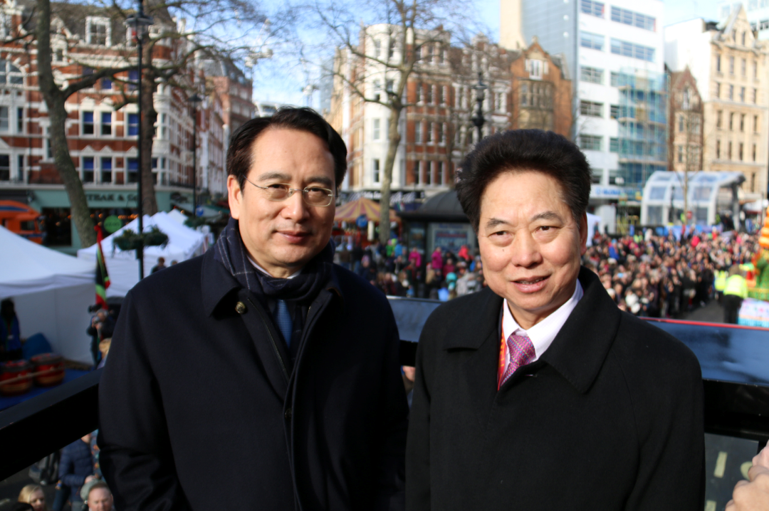 今年2月14日的伦敦猴年新春庆典,创纪录地吸引70万民众观看。图为国侨办副主任谭天星(左)和伦敦华埠商会主席兼会长邓柱廷OBE在巡游花车上。(图片来源:欧洲时报实习记者张涵 摄)
