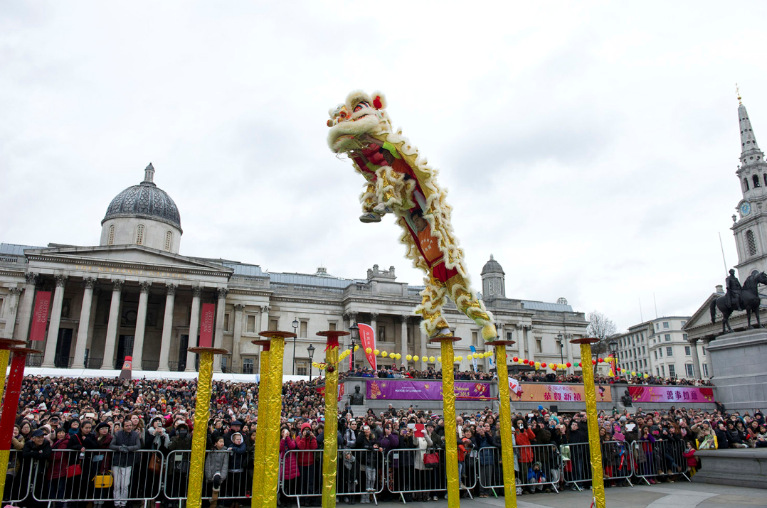 伦敦特拉法加广场的新春庆典,精彩的梅花桩舞狮表演。(图片来源:欧洲时报实习记者张涵 摄)