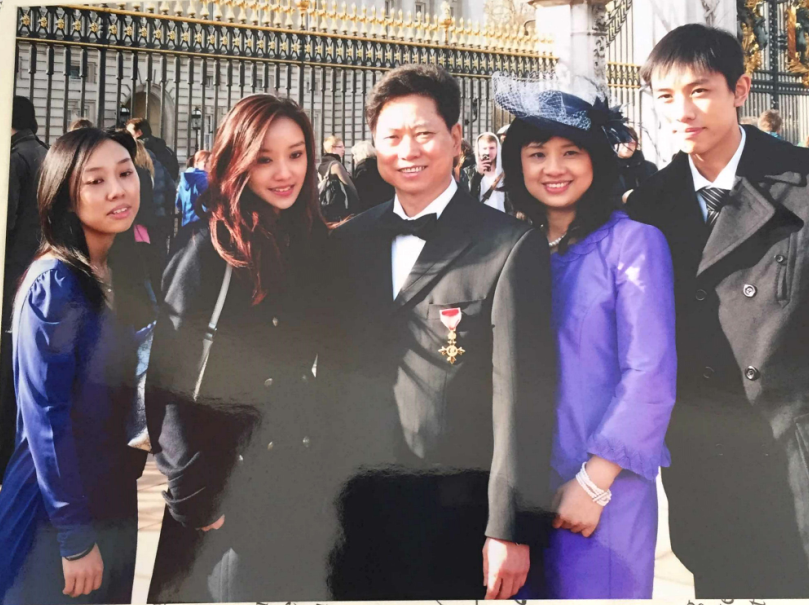 邓柱廷2011年获得大英帝国官佐勋章,他获得查尔斯王储颁发勋章后,和妻子、孩子们在白金汉宫门前合影。(本图由邓柱廷提供)