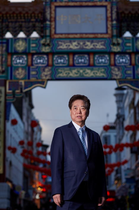 伦敦华埠商会主席兼会长邓柱廷OBE,在伦敦华埠落成的中式新牌楼前。(图片来源:勇智毅 摄)