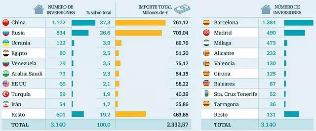 至于投资目的地,尽管受到加泰罗尼亚大区独立风潮的困扰,但在2017年还是巴塞罗那稳居投资吸引力第一的宝座,一共有1384个房地产项目成交,几乎是马德里三倍;马德里的外国人投资房地产数量为490个,排名第三的是马拉加,一共有473个;而西班牙其他城市则远远落后。