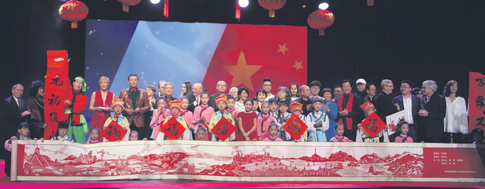 图为中法演员、嘉宾同拜年。(图片来源:本文图片均由欧洲时报记者黄冠杰 摄)
