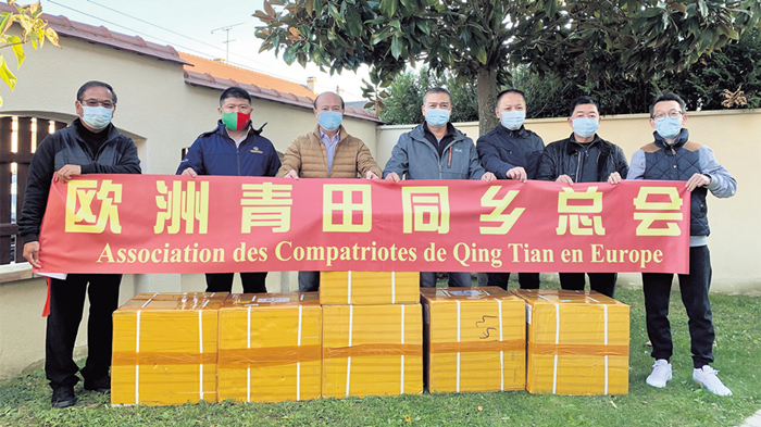 11月5日,欧洲青田同乡总会陈少奇会长(左三)向其法国总部主任孙协发(左一)、法国外籍兵团退伍华人战友会会长徐大玉(左二)、法国浙江商会名誉会长徐胜忠(右四)、欧洲浙江华人联谊会财务长叶永森(右三)、法国海外省青田同乡联谊会会长叶胜军(右二)、欧洲青田同乡总会执行秘书长边海峰(右一)援送抗疫物资,并通过他们援送急需治病救人物资的同胞。(图片来源:本文图片均由边海峰提供)