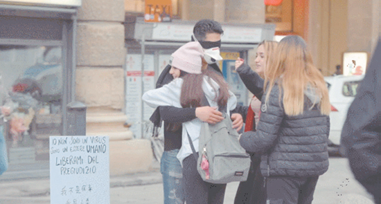 2020年2月2日,在世界各地出现对华人有偏见和歧视的新闻报道后,意大利华裔青年Massimiliano发起“我不是病毒”的街头试验,收获许多陌生人的拥抱。(图片来源:视频截图)