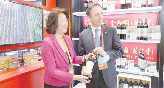 2020年11月,第三届中国国际进口博览会在上海举行。葡萄牙驻华大使杜傲杰(右)走访食品及农产品展区密利拿庄园农业进出口有限公司展位,助力推广葡萄牙葡萄酒。(图片来源:中新社)