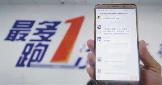 2020月6月12日,青田县行政服务中心工作人员展示手机上的涉侨审批全球代办微信服务群。很多华侨通过这个微信服务群了解并办理相关审批事项。(图片来源:新华社)