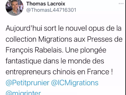 (欧洲时报记者黄冠杰巴黎报道)近日,法国最大连锁书店FNAC正式上架销售旅法中国青年学者李志鹏博士的学术研究成果——《法国华人企业家:温州流散族群模式》(法文:Les entrepreneurs chinois en France Le modèle de la diaspora Wenzhou)学术专著。该著作由法国国际移民学术界享有盛名的图尔佛朗索瓦拉伯雷大学出版社出版,并收入其“移民”系列经典学术丛书。牛津大学《移民研究》(Migration Studies)期刊副主编、英国牛津法国研究所(Maison Française d'Oxford)研究员托马斯拉克鲁瓦(Thomas Lacroix)教授在该书全球正式首发之际,专门在其个人社交网站推介李志鹏法文专著,并将之称为“一部让你畅游在法国华商世界中的新力作”来推介此部有关华侨华人经济研究的法文学术著作。