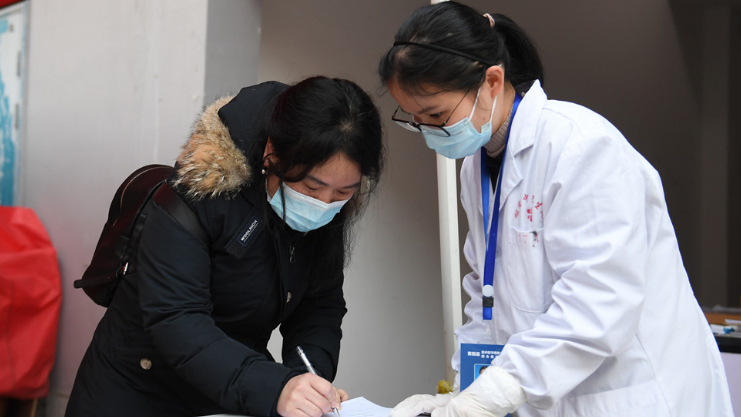 2月5日,一位结束医学观察的华侨在离开观察点时登记信息。(图片来源:中新社)