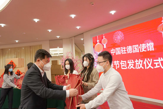 中国驻德国大使吴恳向旅德同胞发放“春节包”。(图片来源:中新社)