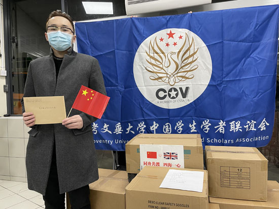 2月2日,考文垂大学学联留学生代表在英国考文垂领取防疫物资“春节包”。