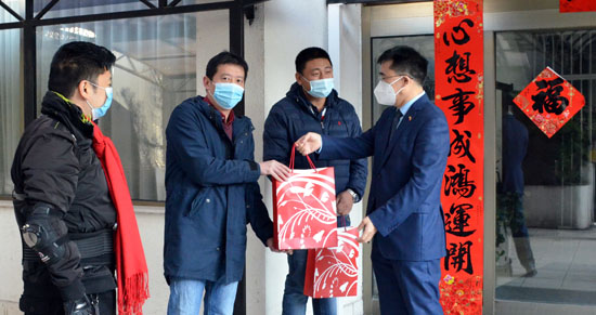 2月4日,中国驻北马其顿大使张佐(右一)在北马其顿首都斯科普里向在北马中国同胞发放“春节包”。