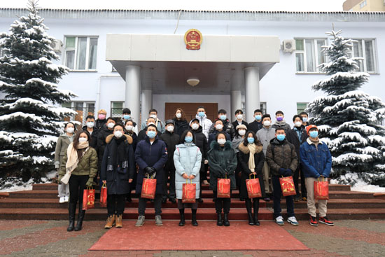 1月30日,在白俄罗斯首都明斯克,中国驻白俄罗斯大使馆人员与领取“春节包”的留白学生和旅白华侨代表合影。