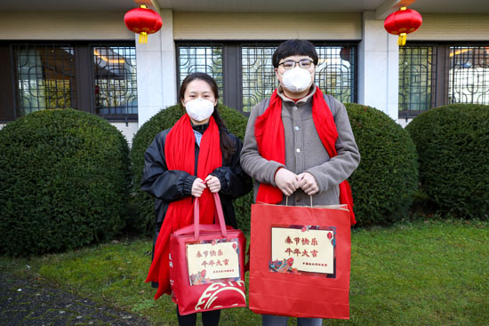 2月3日,旅比留学生代表宋竹芸(左)、何家成展示他们领到的“春节包”。