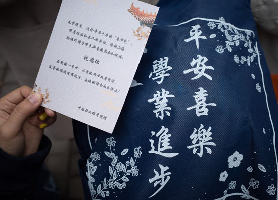 图为2月6日在西班牙马德里拍摄的中国驻西班牙大使馆为留学生准备的“春节包”中的慰问信。