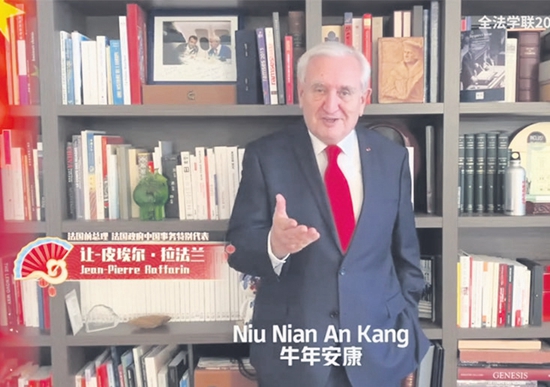 法国前总理、法国政府中国事务特别代表让-皮埃尔·拉法兰(Jean-Pierre Raffarin)发来视频祝福中国朋友身体健康、牛年快乐。拉法兰用中文向大家问候:“牛年健康!”他也向全体中国同胞致以新春问候,希望中国新的一年能实现最好的增长,获得最大的发展。他祝愿世界保持和平、平等合作和友谊,摒弃单边主义、孤立主义和保护主义祝愿中国和欧洲在新的一年友谊长存,中国和法国之间开展健康、有益和平衡的合作,加强经济、文化领域的交流。