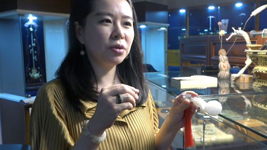 杨晓雅向记者展示纯手工打造的壁厚仅1毫米香囊,这件玉器用到了镂空透雕、薄胎、榫卯以及嵌金等中国玉雕工艺。(图片来源:欧洲时报特约记者卞戈 摄)