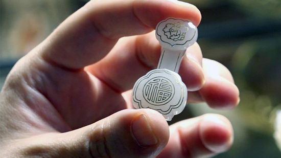 制作时,需要在本来就薄如蝉翼的玉石表面开出极细的纹路——燕尾槽,将不到0.5毫米的24K纯金丝严丝合缝地嵌到其中。“这个过程需要连续不断敲击完成,玉的质地与金属截然不同,脆并且易碎,每一琢,每一锤都如履薄冰,稍有不慎就会金销玉陨,前功尽弃。”杨晓雅介绍。