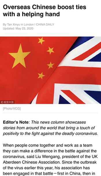 2020年04月16日,阿伯丁华人联合会向阿伯丁市政府和阿伯丁郡政府捐赠第一批防疫物资,包括10000个医用口罩。04月23日,再次进行了第二次捐赠,包括10000个医用口罩。这两批次的捐赠体现了在疫情形势严峻之际,阿伯丁华人华侨回馈当地社会、助力中英关系发展的友好情意。China Daily对此次捐赠进行了采访并发表了报道。