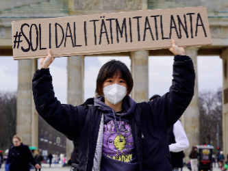 28日下午,数个亚裔团体在德国柏林举行集会,悼念美国亚特兰大枪击案中的八名受害者,反对美国、德国以及世界范围内针对亚裔的种族主义。