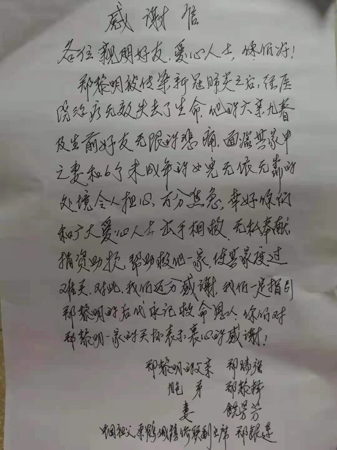 图为逝者郑黎明的家属从中国发来的感谢信。