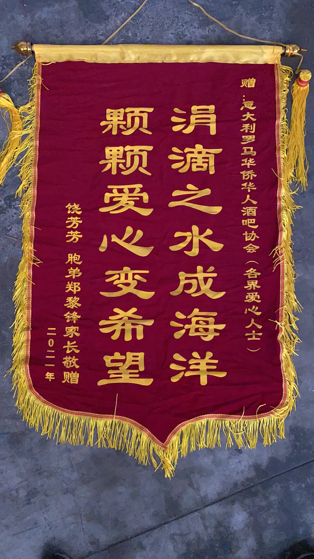 图为逝者郑黎明家属向意大利罗马华侨华人酒吧协会和各界爱心人士赠予的锦旗。