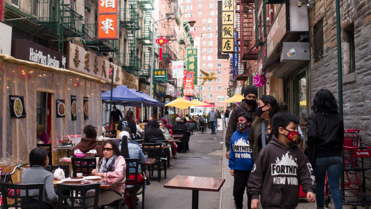 3月27日,美国纽约曼哈顿唐人街餐厅顾客在户外用餐,街区秩序井然。(图片来源:中新社)