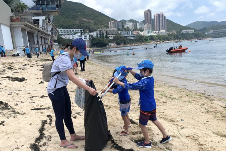 图为香港侨界社团联会会员张女士与两名孩子正在清洁海滩。(图片来源:中新社)