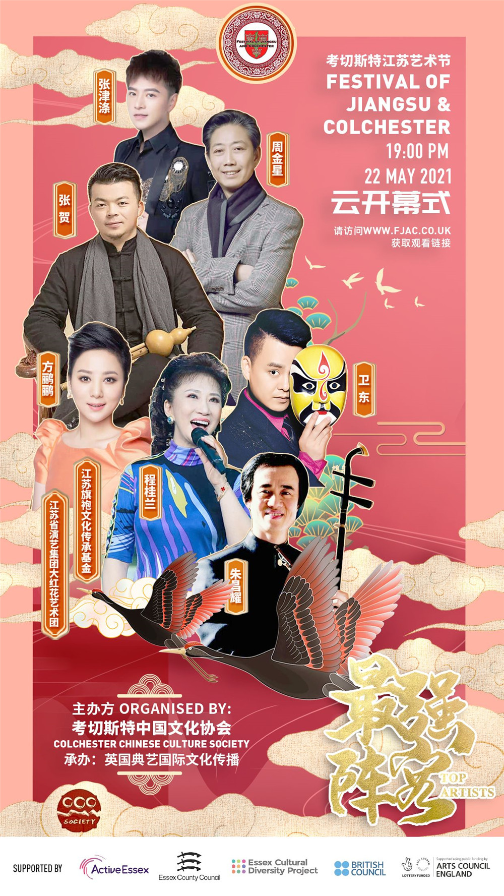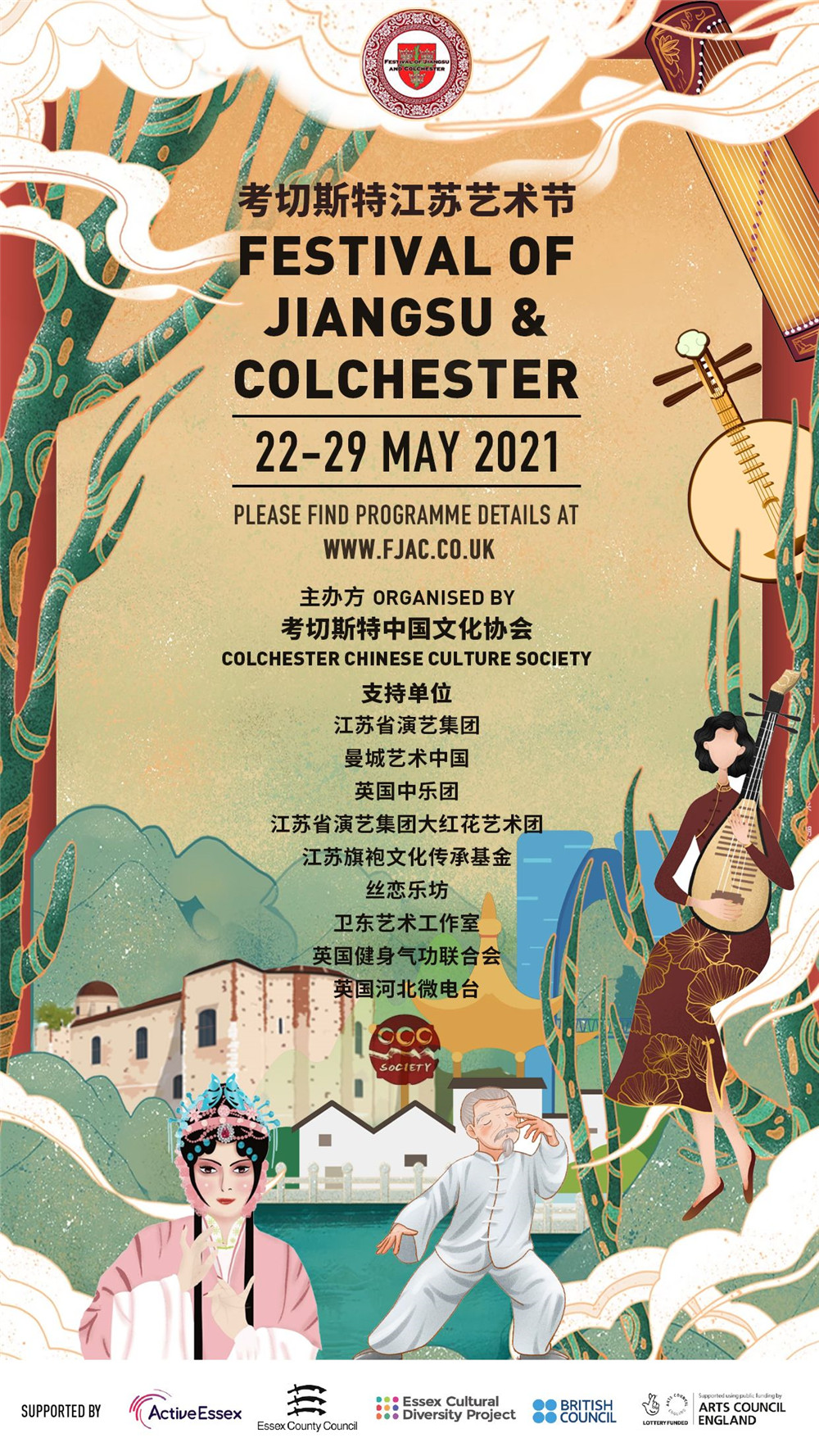 一直以来,考切斯特中国文化协会致力中国文化传播,促进中英文化艺术交流。此时此刻,在全世界经历了一年多疫情的困扰,人们为战胜病毒不懈努力,精神和身体备受挑战的时候,对文化交流的渴望可想而知。考切斯特江苏艺术节得到Arts Council England,Essex Culture Diversity Project以及中国驻英国大使馆的支持。请查看艺术节官网www.fjac.co.uk获取艺术节活动日程安排以及线上观看链接。