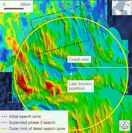 《中国海洋报》报道,事故发生后,各方一共组织了四次大规模搜索。前两次,法国航空管理局与法国海军、美国海军、北约组织、巴西、英国和德国等,先后组织了由飞机、卫星、军舰、以及潜艇组织的三维立体大规模的寻找行动,但仍然一无所获。