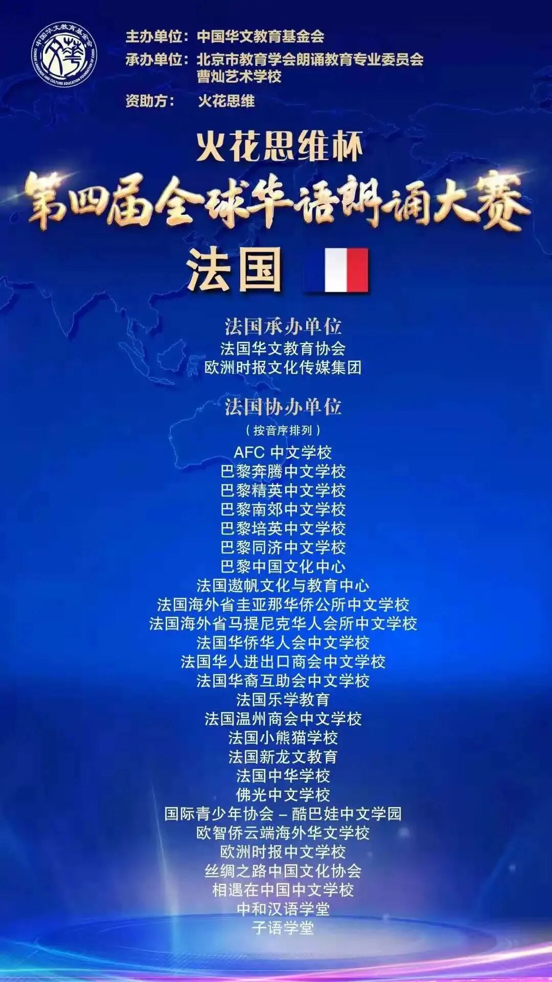 第四届由“全球华语朗诵大赛”中国华文教育基金会主办,北京教育学会朗诵教育专业委员会、曹灿艺术学校承办,火花思维赞助。法国地区比赛由法国华文教育协会、欧洲时报文化传媒集团承办。