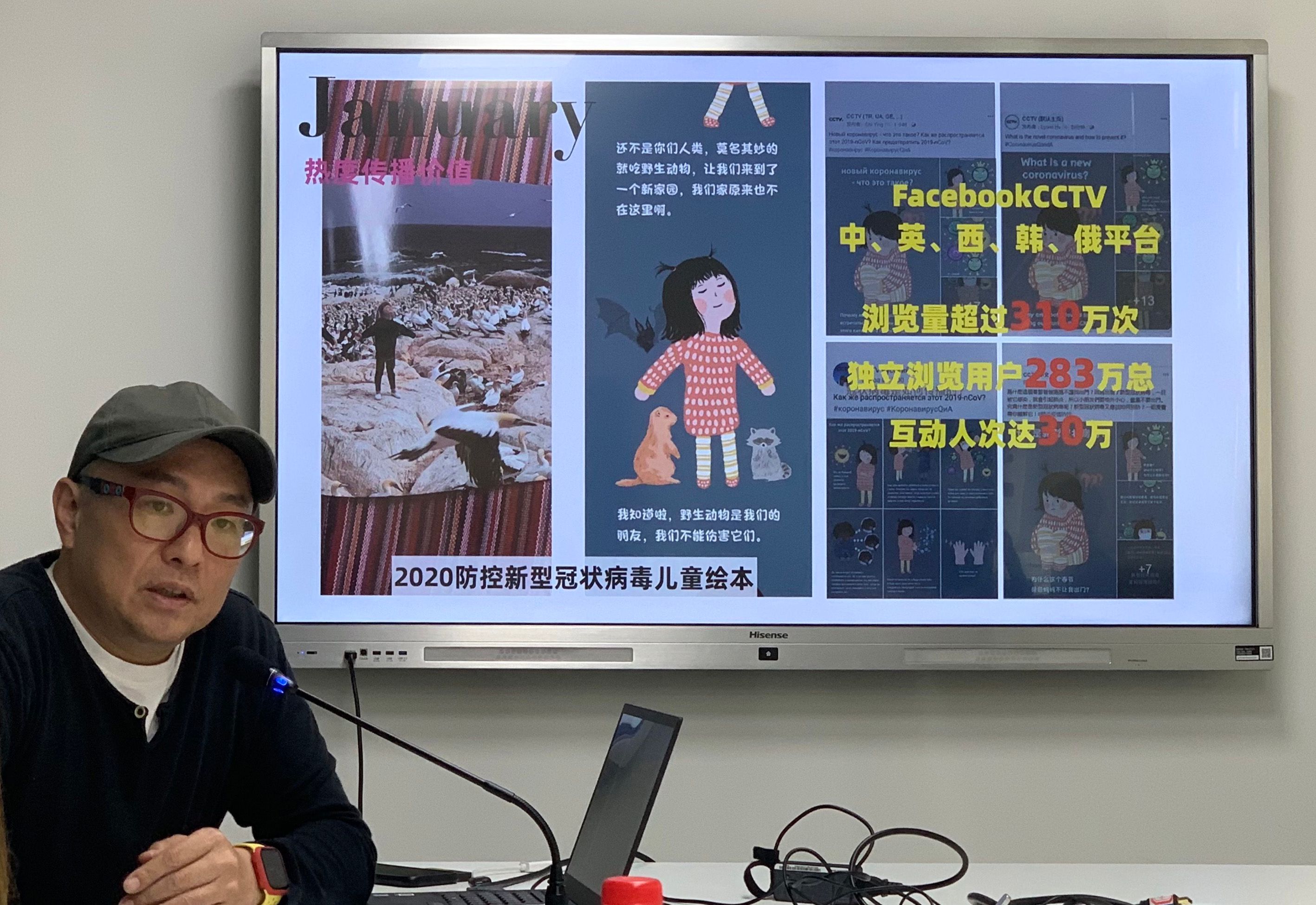 疫情期间,丁肇辰带领团队历时五天制作了多语言版本“防控新型冠状病毒儿童绘本”。图为丁肇辰在分享绘本的相关设计内容。