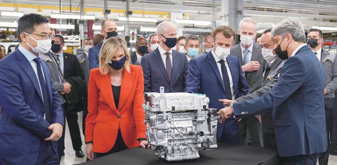 马克龙一行参观雷诺工厂,左1为远景科技集团CEO张雷。(图片来源:欧洲时报)