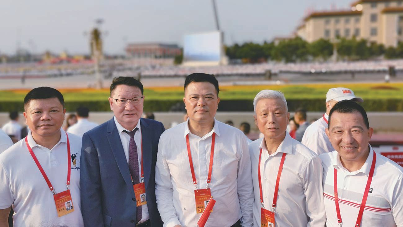 法国华侨华人会主席任俐敏(中)、法国法华工商联合会会长戴安友(右一)、名誉会长黄学铭(右二)、中法友谊互助协会名誉会长吴时敏(左一)、法国温州商会永远名誉会长胡镜平于7月1日,在天安门广场参加庆祝中国共产党成立100周年大会后合影。(图片来源:受访者供图)
