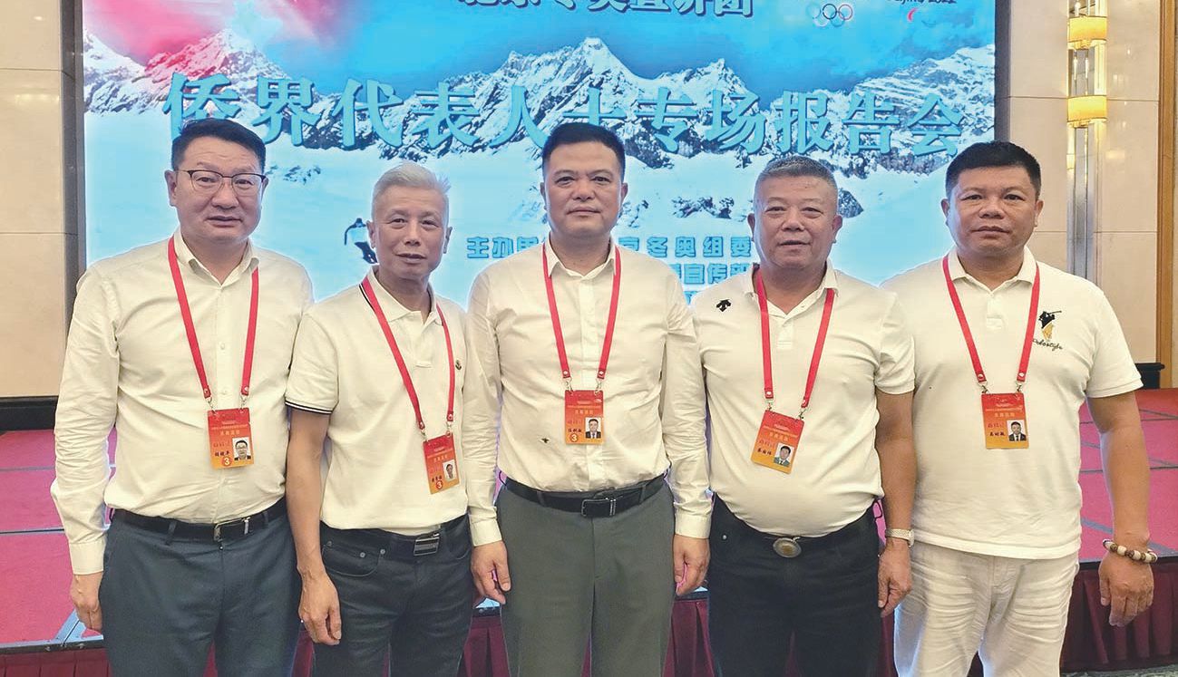 法国华侨华人会主席任俐敏(中)、法国法华工商联合会名誉会长黄学铭(左二)、中法友谊互助协会名誉会长吴时敏(右一)、法国温州商会永远名誉会长胡镜平(左一)和法国福建商会会长蔡国伟参加北京冬奥会侨界代表人士专场报告会。(图片来源:受访者供图)