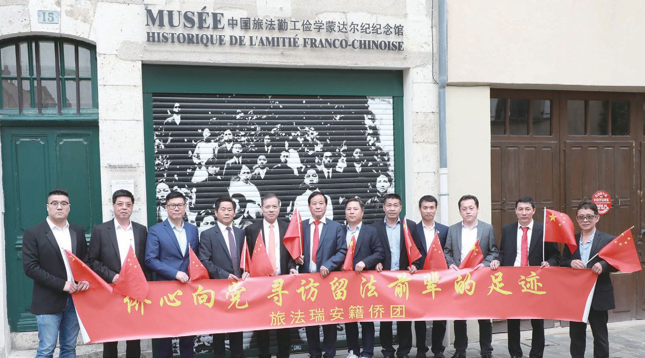 上午10点不到,大家纷纷抵达中国旅法勤工俭学蒙达尔纪纪念馆。当这些旅法社团瑞安籍代表看到纪念馆门口卷帘门上绘有的一张100多年前,来到蒙达尔纪求学,并寻找改造中国和世界的真理的留法前辈身影的照片时,心情非常激动,纷纷拍照留影。每一个人手持一面小的中国国旗,并拉出了一条“侨心向党,寻访留法前辈的足迹”的横幅,在纪念馆门前拍下一张珍贵的合影。