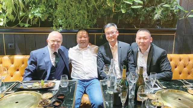 卡泽纳夫(左1)赞叹华商的多种经营和全面发展。左2至3为姜金玉、韩博、陈东晓。
