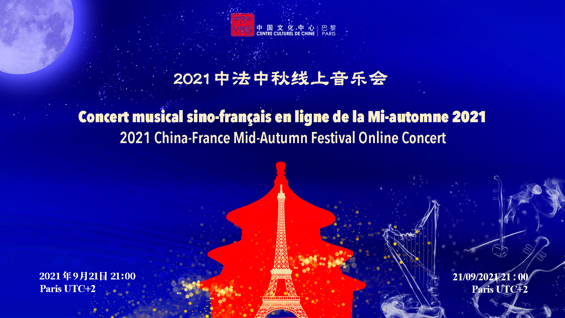 2021年,为与法国人民共度中秋,分享节日的快乐与喜悦,除举办线上展览、视频展播等活动外,巴黎中国文化中心将举办“2021中法中秋线上音乐会”,邀请法国著名钢琴家JEAN-FRANÇOIS ZYGEL、法国著名打击乐演奏家JOEL GRARE、瑞士著名竖琴演奏家PARK STICKNEY、法国著名激光竖琴演奏家TIME COMPOSER、著名旅法二胡演奏家果敢等15位中外音乐家,以中国民乐与西洋乐合奏为主要表现形式,以“月亮、团圆、友谊”为主题,开创性兼顾中西方古典及新潮乐器,融合东西方艺术特色,演奏10首中西经典代表作品和原创作品,用音乐的语言,阐释“阖家幸福”的思想内涵,为法国民众奉上一场精心编排、高质量的线上音乐会,送去节日的祝福,用旋律传递温暖,借音乐加深中法两国人民的深情厚谊。